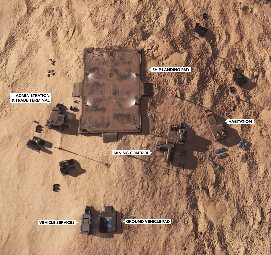 Overhead view of ArcCorp Mining Area 141 on Daymar, with all notable structures labeled.